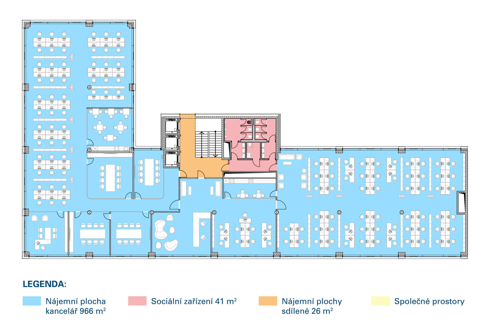 Vzorová dispozice – 1 nájemce – koncept velkoprostorová kancelář