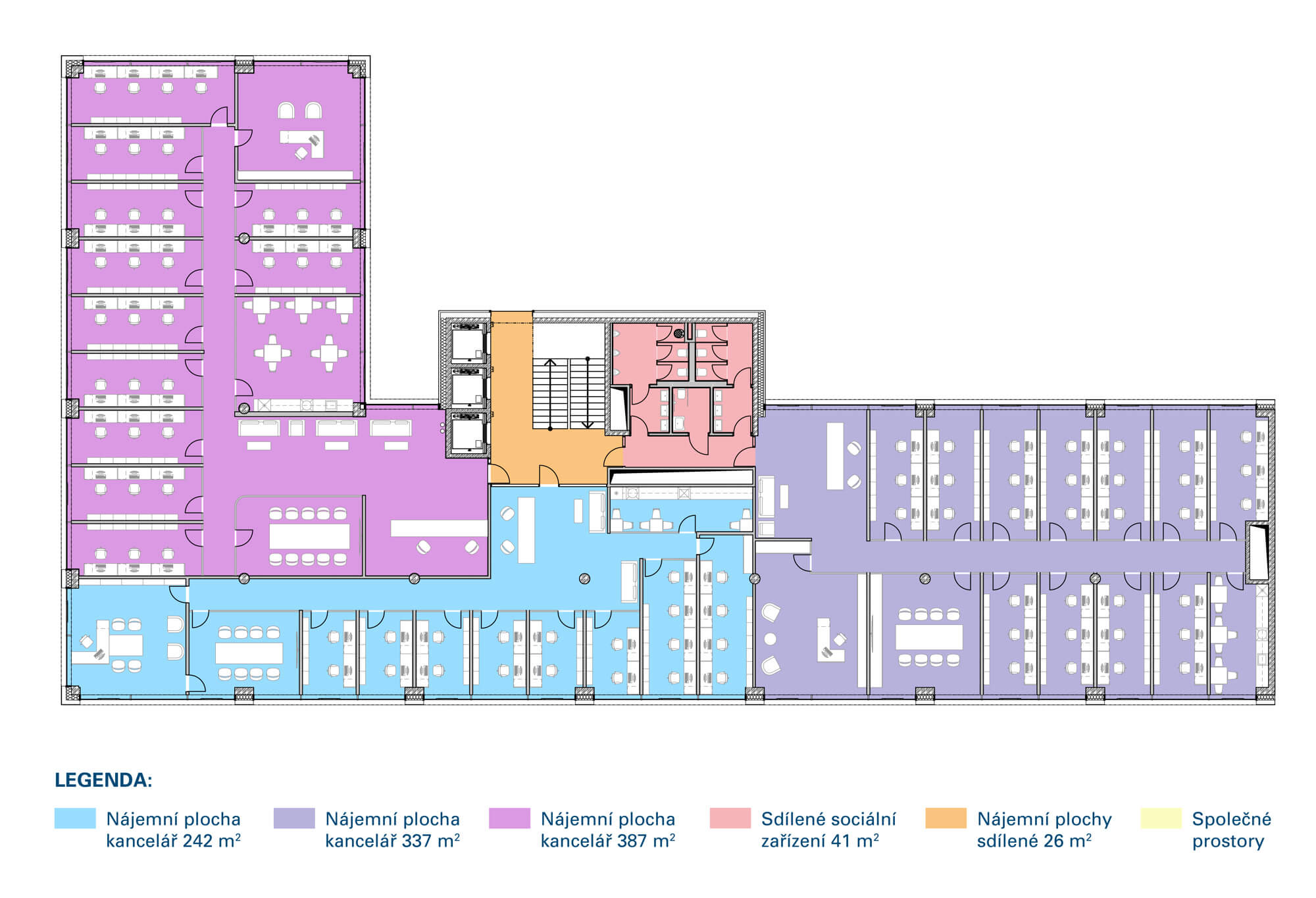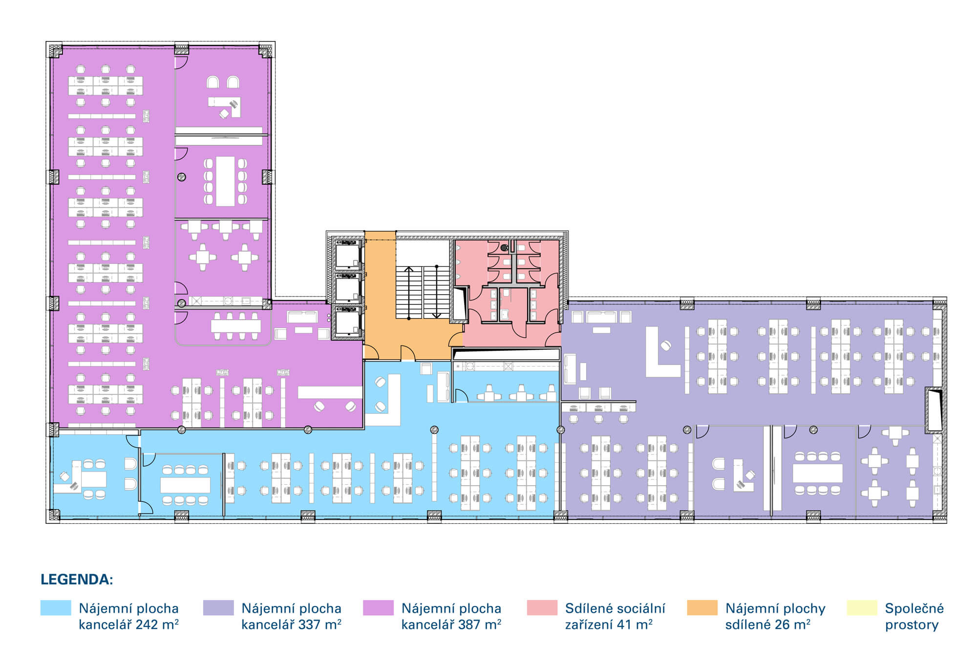 Vzorová dispozice – 1 nájemce – koncept individuálních kancelář